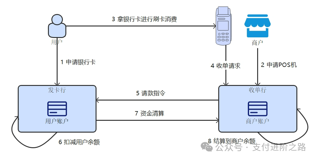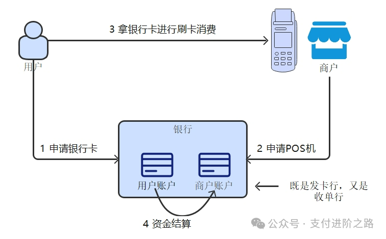 那POS机是怎么来的?这就要说到收单行 了,POS机是收单行提供的终端设备。用户刷完卡后出来的单子一式两份,留在商户那里的一份会由收单机构收走,再去完成背后的资金清结算,把钱结给商户。“把单子收走”这个动作直观又好理解,所以“收单”这个词就被流传下来了。