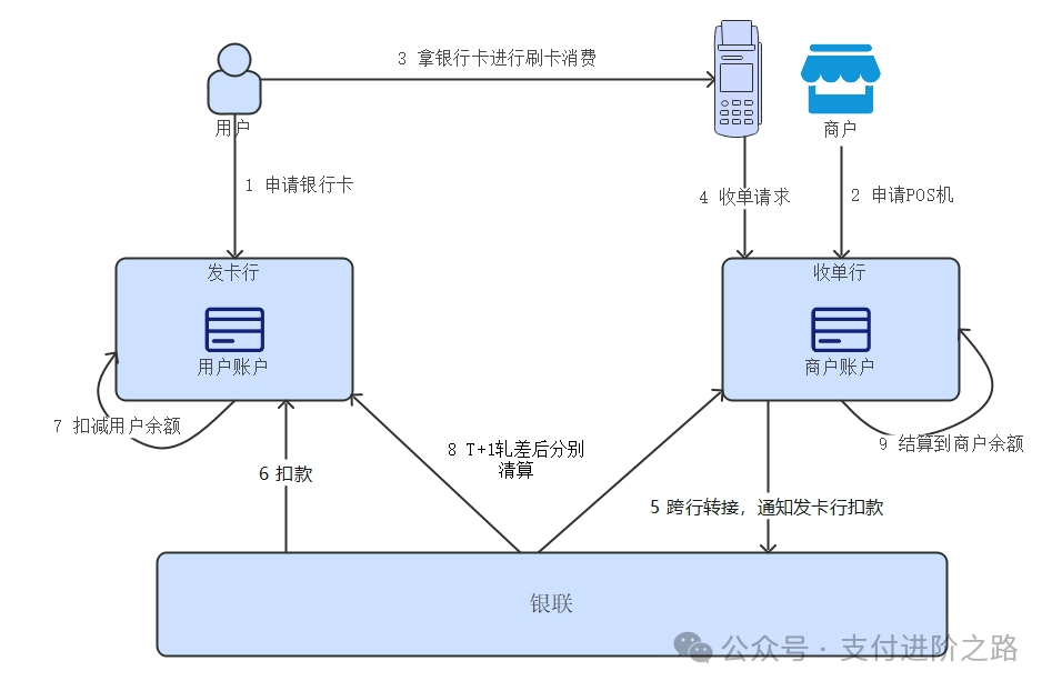 发行信用卡的银行叫做发卡行,用户到发卡行填表申请信用卡,有了卡之后怎么用呢?得拿着卡到POS(Point Of Sale) 机上刷一下,刷完以后输入密码,出来一张单子,用户需要签字确认,这就完成了消费,注意这时候商家并没有真正收到钱。