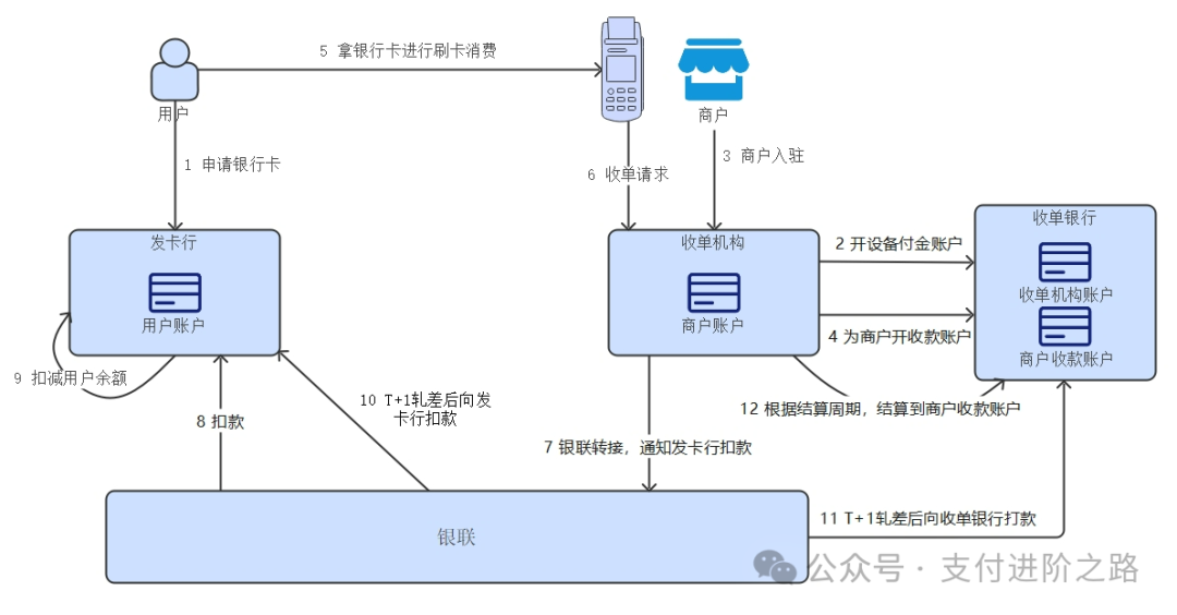 1.用户申请银行卡,发卡行审核后给用户发放银行卡,并且在银行内开设一个用户账户