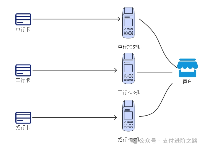 这一阶段由收单机构提供的POS机就是通用的了,所有银联卡都可以刷。