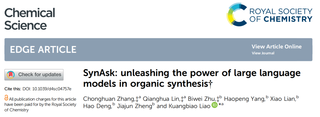 Zhang C, Lin Q, Zhu B, et al. SynAsk: Unleashing the Power of Large Language Models in Organic Synthesis[J]. arXiv preprint arXiv:2406.04593, 2024.