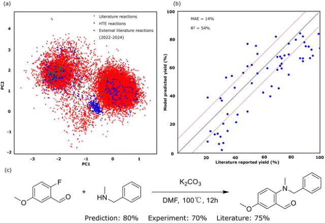 作者讨论了SynAsk在合成化学方面的表现,并通过几个案例研究和基准测试进行评估。图5展示了SynAsk内置的亲核芳香取代(SNAr)反应模型在测试集和外部文献反应数据上的预测结果。在测试集上进行五重交叉验证,平均绝对误差(MAE)为11.7%。对于外部文献反应数据,随机收集了60个近三年(2022-2024年)发表的SNAr反应,模型预测产率与文献报道产率的MAE为14.1%。图5a显示了SNAr反应的化学空间,图5b比较了模型预测产率与文献报道产率,图5c展示了一个具体的反应实例。