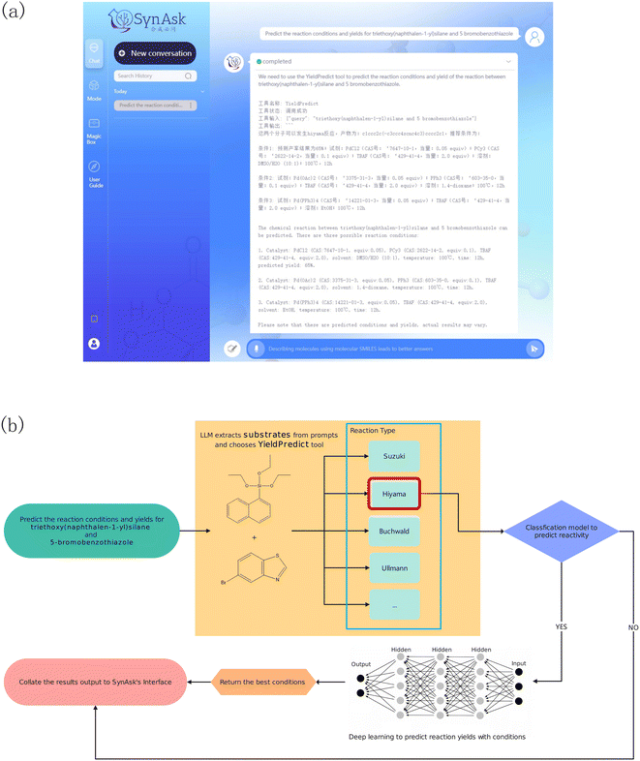 尽管如此,如果没有进一步使用有机化学领域数据进行调优,LLMs在有机化学相关任务中仍面临挑战。为弥补这一差距,已开发了几种有机化学特定领域的LLMs。我们长期致力于化学研究中的AI,开发了一系列机器学习和基于计算的工具来解决有机化学的基本任务。如图1所示,我们介绍了由AIChemEco开发的有机化学综合特定领域大语言模型SynAsk。该模型使用有限的特定领域化学数据进行了优化,并与思维链方法相结合以理解用户提示,利用LangChain与我们现有的工具套件无缝连接。这一框架具有适应性,有潜力扩展到其他化学领域。