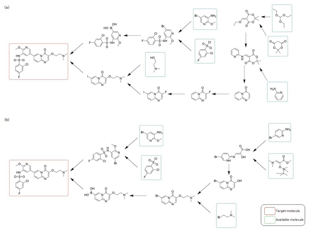 图6展示了SynAsk在11549个ChEMBL数据库中的小分子药物的逆合成路线规划任务上的表现。SynAsk成功预测了6358个分子的逆合成路线,占查询分子的55%,显著优于现有的先进逆合成规划工具AIZynthFinder的27%。以Gilmelisib的逆合成为例,SynAsk提出了一条7步合成路线(图6a),与有经验的合成化学家提出的路线(图6b)在长度和前体数量上一致,并采用了价格低廉的前体和常见的反应。