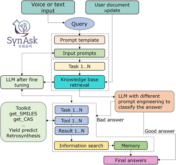 今天为大家介绍的是来自广州国家实验室廖矿标课题组的一篇论文。自然语言处理(NLP)领域随着大语言模型(LLMs)的出现经历了一场变革性的转变,在各种语言任务和应用中掀起了一场革命。将LLMs整合到特定领域可增强其在特定领域的应用能力。值得注意的是,NLP在有机化学领域取得了重大进展,尤其是在预测合成任务方面,为专门针对有机化学领域开发LLMs铺平了道路。本研究介绍了SynAsk,这是一个由AIChemEco公司开发的综合性有机化学特定领域LLM平台。通过使用特定领域数据对LLM进行微调,并将其与思维链方法相结合,SynAsk可以无缝访问我们的知识库和高级化学工具,以问答格式实现功能。这种新颖的方法将微调技术与外部资源整合相结合,形成了一个专门针对有机化学的模型,有助于推动该领域的研究和发现。SynAsk可在https://synask.aichemeco.com上访问,代表了在利用自然语言处理进行合成应用方面的重大进步。
