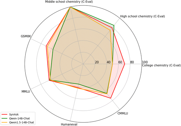 图4显示了SynAsk模型在各项评估指标上的优异表现,尤其是在化学领域的应用。例如,在大学化学方面,SynAsk获得了70.83%的高分,远超过其前身基础模型Qwen-14B-Chat和Qwen1.5-14B-Chat的50%。这一结果凸显了SynAsk模型在利用现有数据源解决复杂化学问题方面的显著改进。