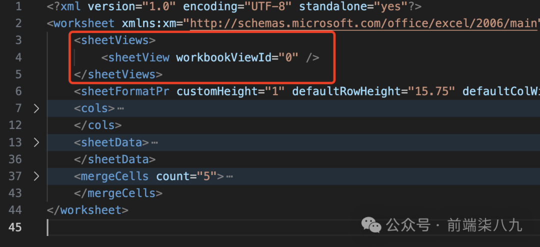 sheetView 元素描述了工作表的视图设置(如显示模式等)。这里添加了一个 sheetView 元素,并设置了其 workbookViewId 属性。sheetViews 是一个容器元素,包含了多个 sheetView 元素。