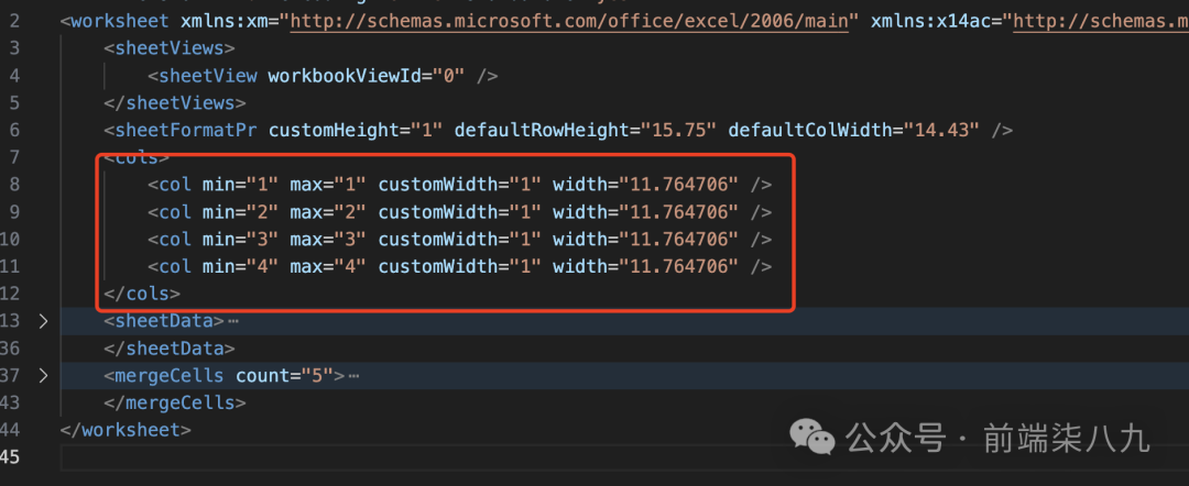 min 和 max:指定列的范围(这里是单列,min 和 max 都是当前列的索引)。customWidth 和 width:定义列宽度。