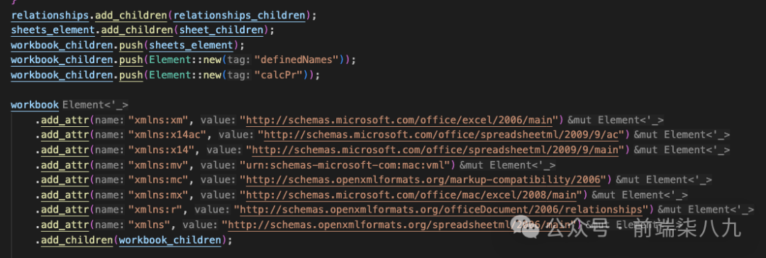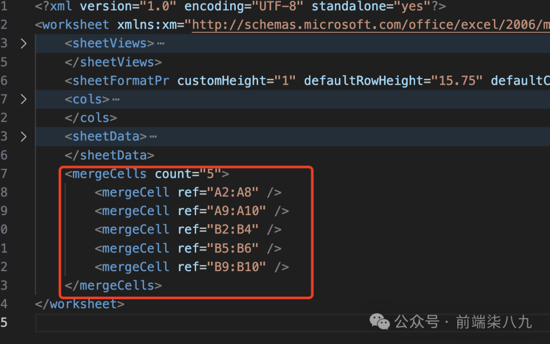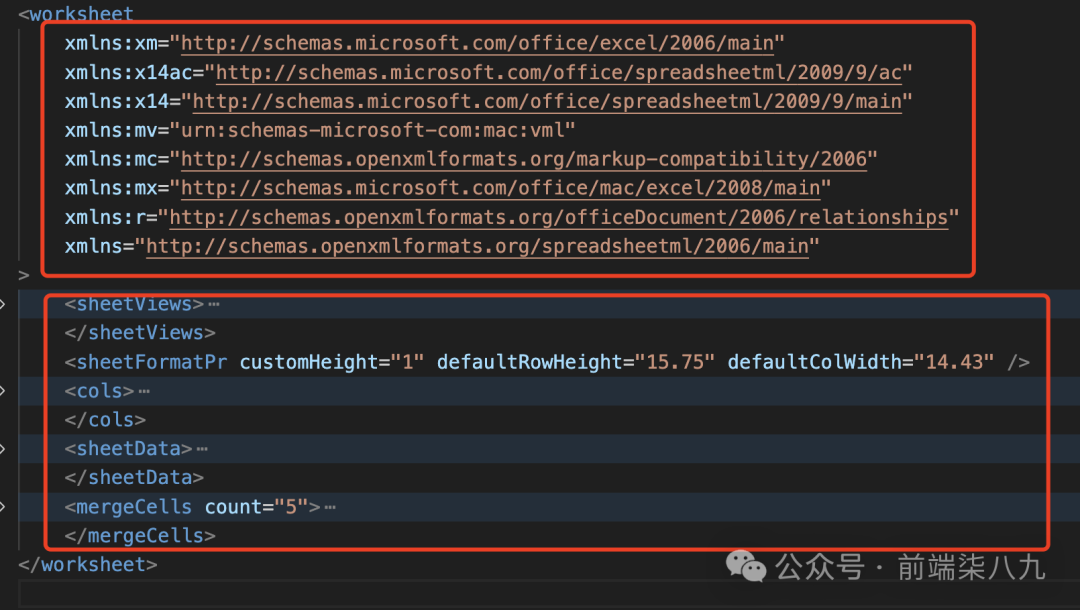 这部分代码为工作表元素添加了多个 XML 命名空间(xmlns),以确保生成的 XML 文件符合 Excel 文件的标准。接着,将所有的子元素(如 sheetView、sheetData、mergeCells 等)添加到 worksheet 元素中。