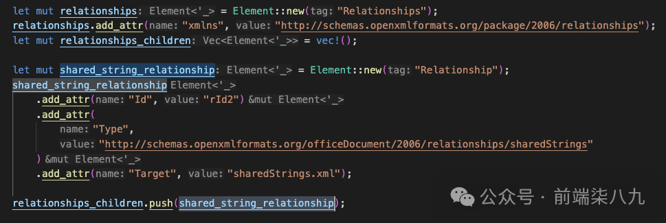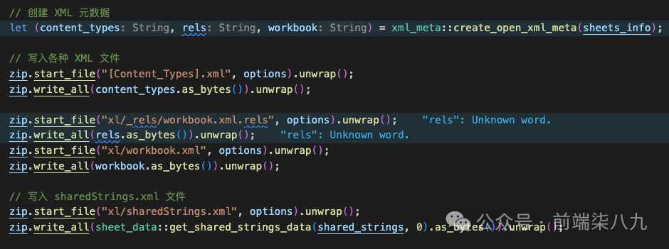 json2sheet.rs在上一篇文章中讲过,它的作用就是将前端页面中传入的json转换为构建xml的所需结构lib.rs这里只有一个函数,就是我们在前端调用的主函数generate_excelsheet_data.rs:该文件用于基于json2sheet.rs返回的数据和json中特定的数据,构建xml的数据部分struct_define.rs:用于存放该项目中用到的Structutils.rs:用于定义一下工具方法。log_to_console封装web_sys[4]::console,用于在前端中打印信息set_panic_hook封装console_error_panic_hook[5],让错误更好的控制台捕获xml.rs:基于sheet_data拼装xml信息xml_meta:用于生成符合open xml的元数据信息下面,我们就会拿我认为主要的代码,来讲讲核心逻辑。