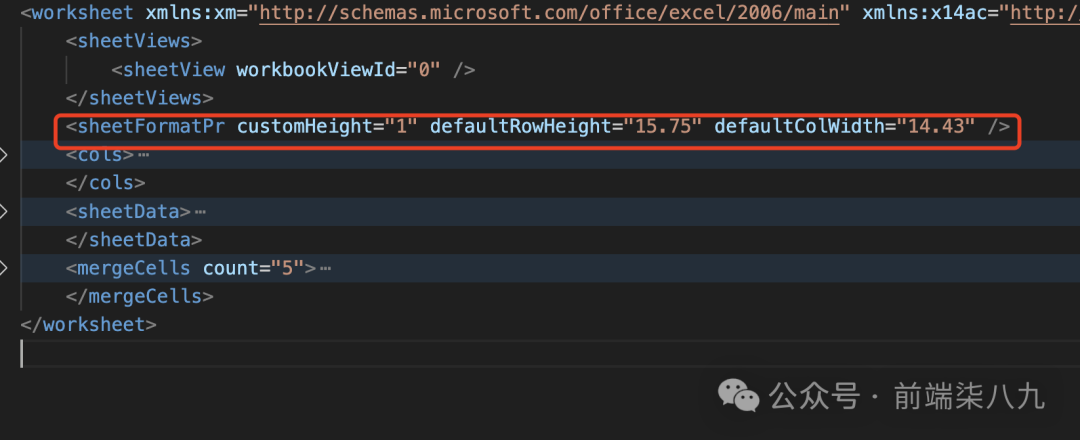 sheetFormatPr 元素定义了工作表的格式,包括行高(defaultRowHeight)和列宽(defaultColWidth)等属性。此处设置了默认行高为 15.75 和默认列宽为 14.43。