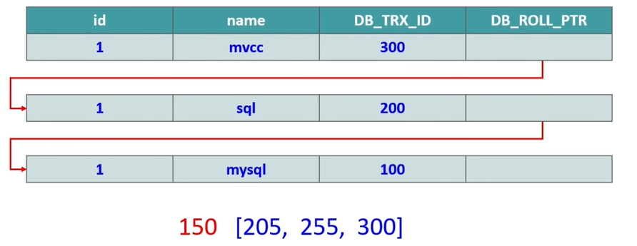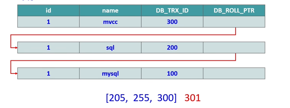 下面的图中:有3个事务 100 、200 、300 ,活跃事务有 205 、255 、300 。也就是说只有300是未提交的。100和200 已经提交了。