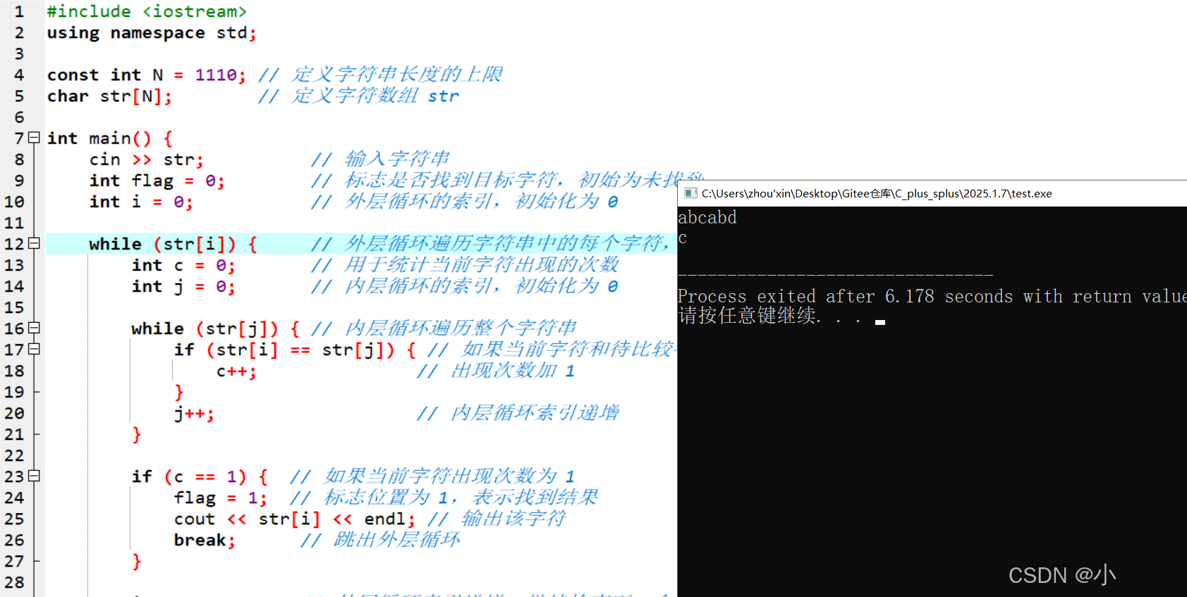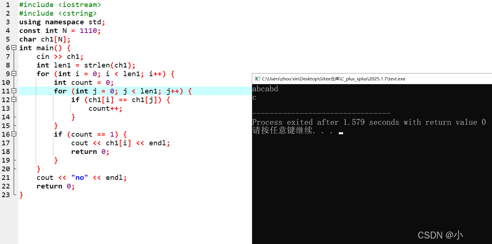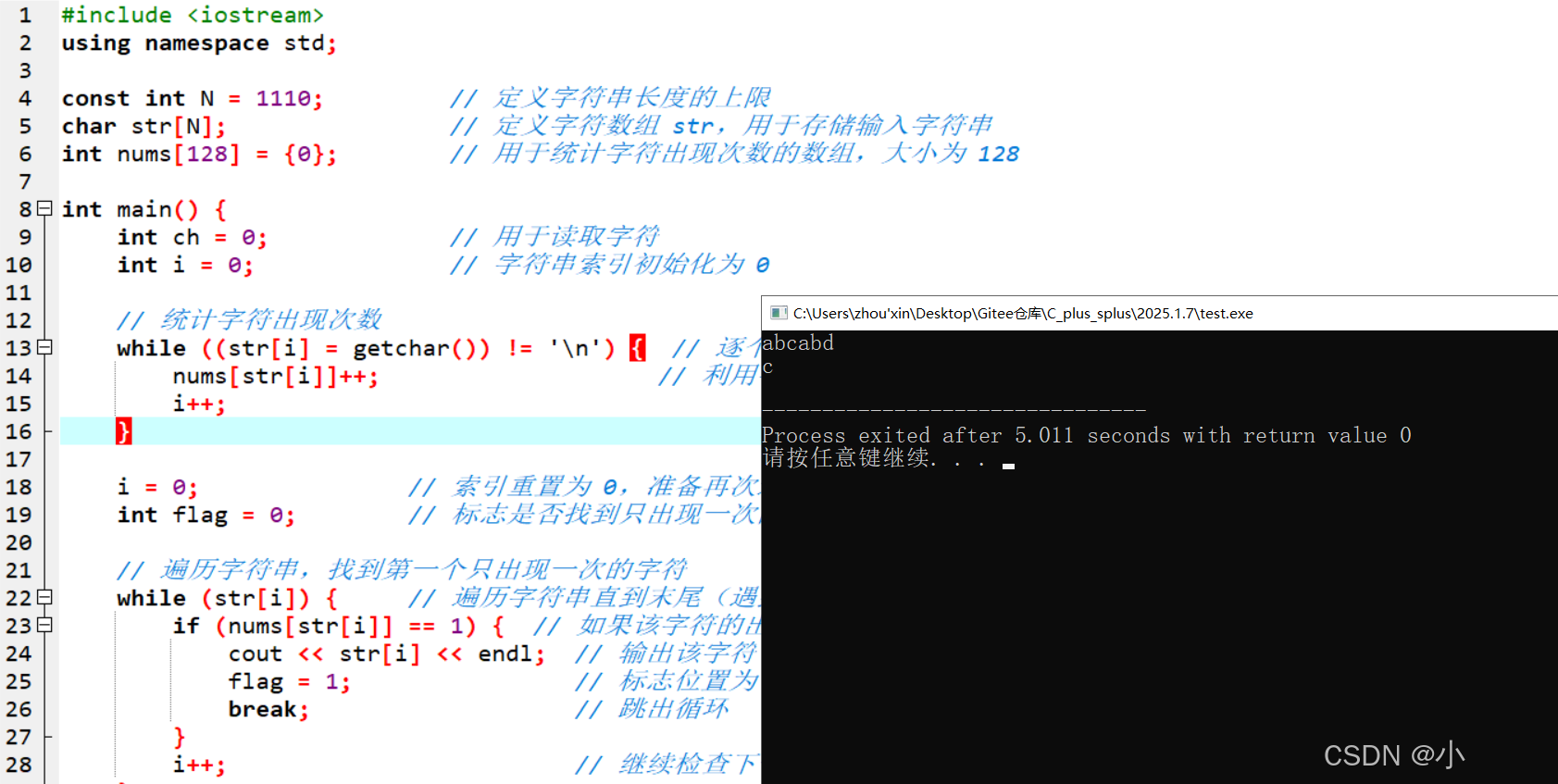 int flag = 0;        // 标志是否找到只出现一次的字符,初始为 0