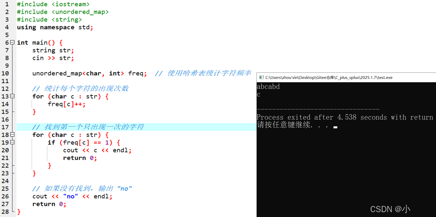 2. 如果某个字符的统计次数为 1,则输出并结束程序。