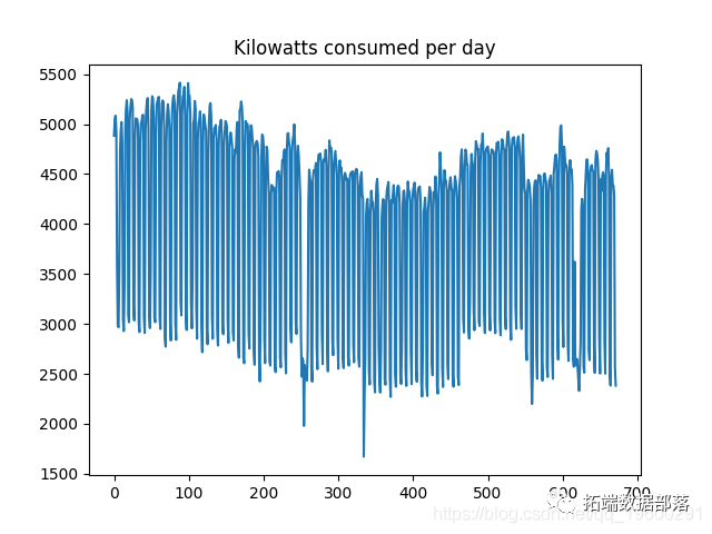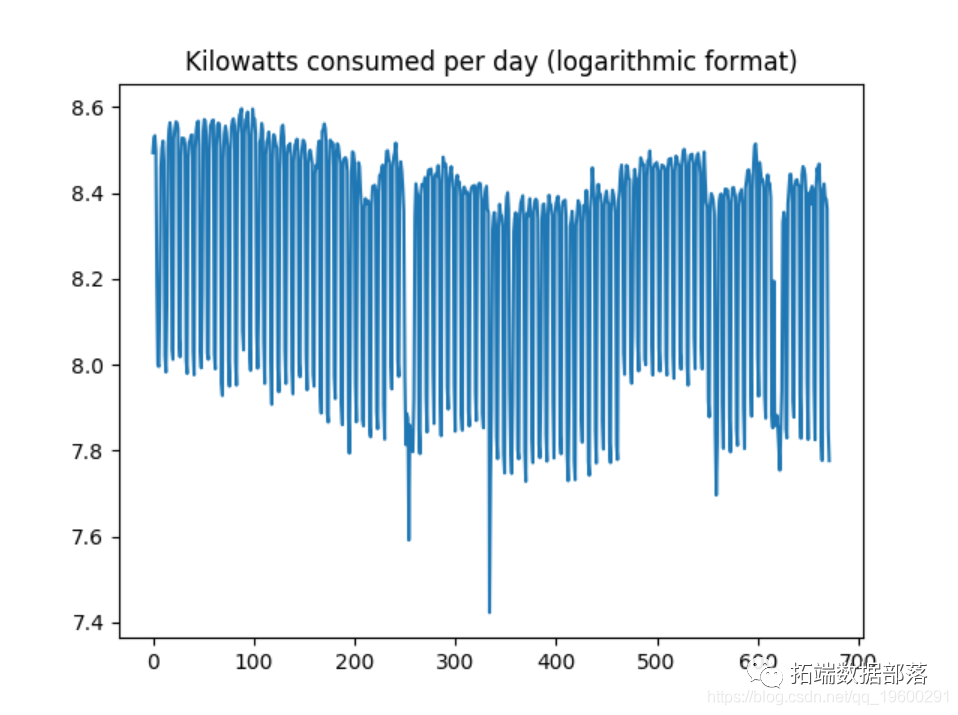inversetransform,= plt.plot(scaler.inverse_transform(dataset))该模型显示训练数据集的均方根误差为0.24,测试数据集的均方根误差为0.23。平均千瓦消耗量(以对数格式表示)为8.27,这意味着0.23的误差小于平均消耗量的3%。