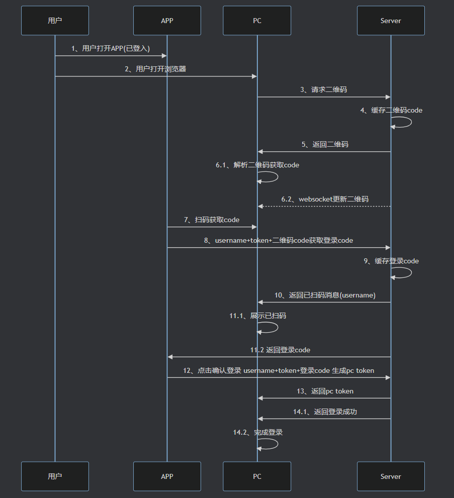 A->>S: 12、点击确认登录 username+token+登录code 生成pc token