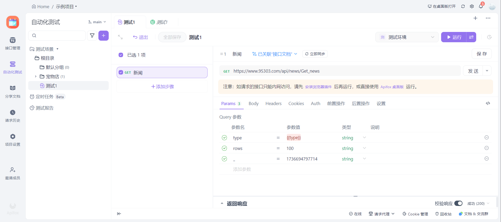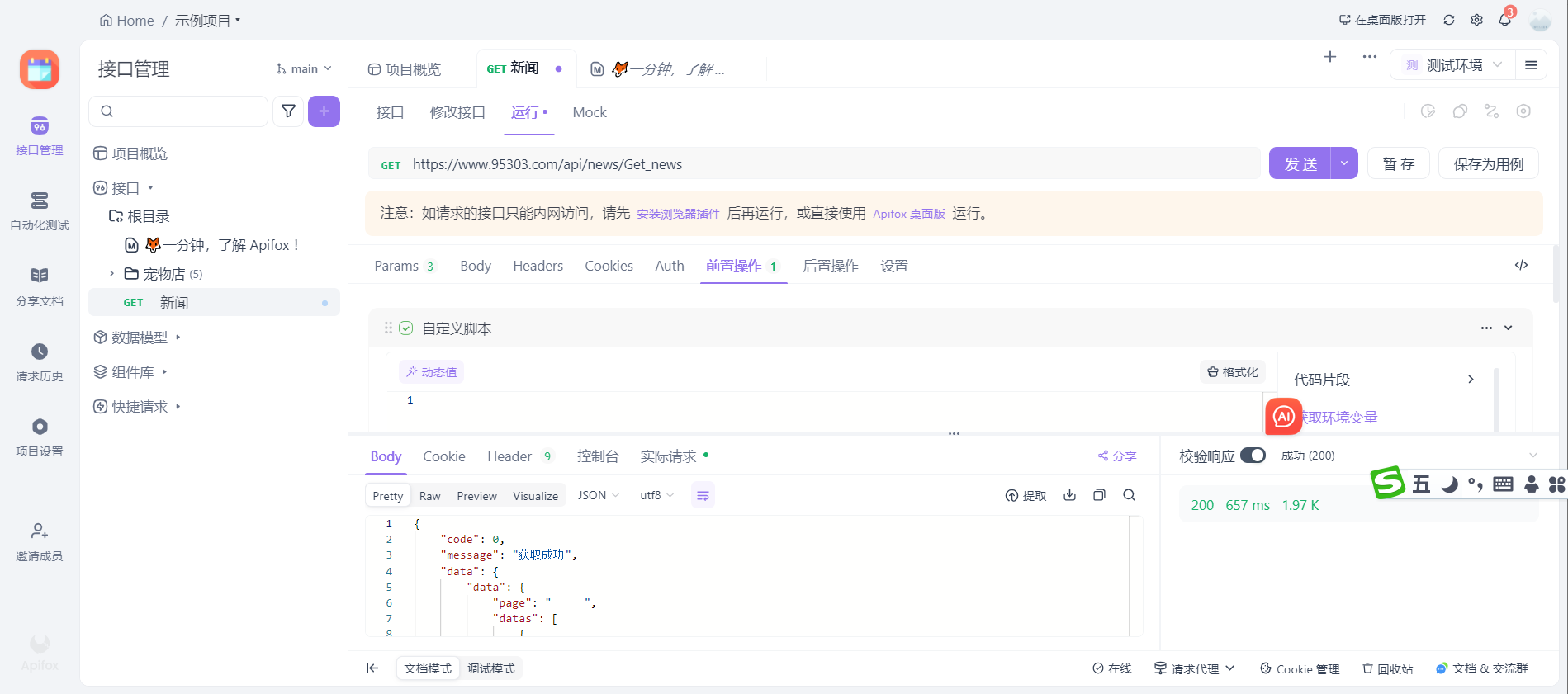 可以点击新闻接口就会进入到实际的接口中。这个接口中的所有变化与接口管理中的是不互通的。