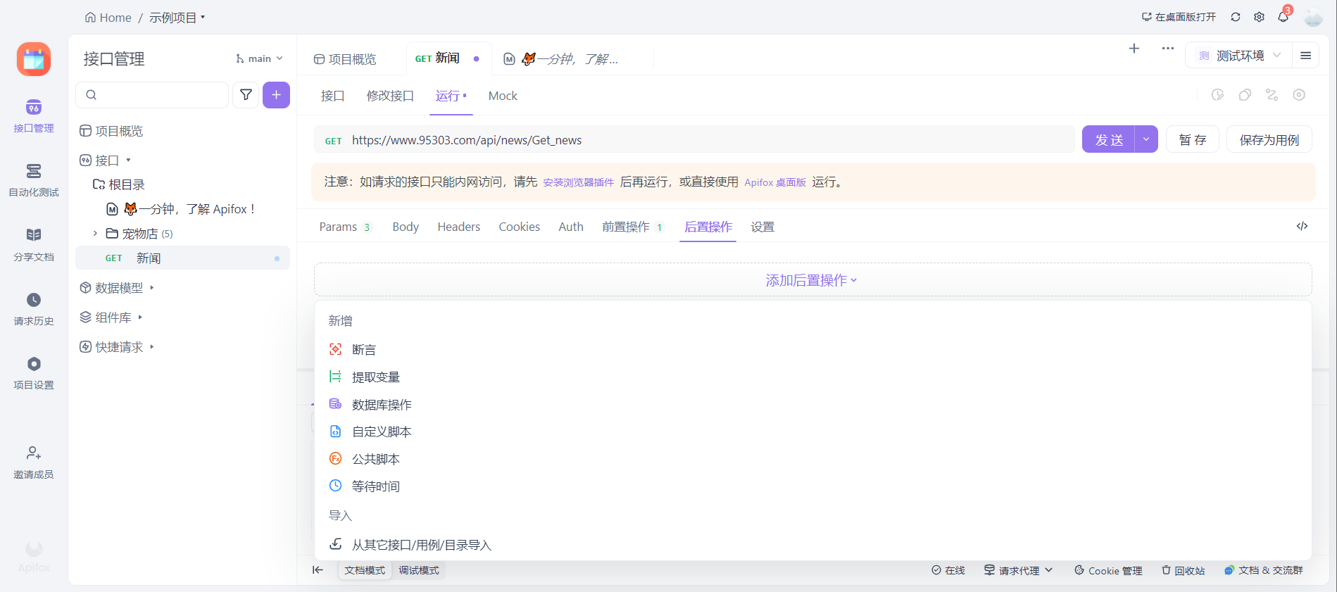 可以看我们可以看到后置操作中有断言、提取变量等一些操作。那我们就可以断言接口是否正确返回,可以提取结果中的某些变量进行存储以进行下一步操作。