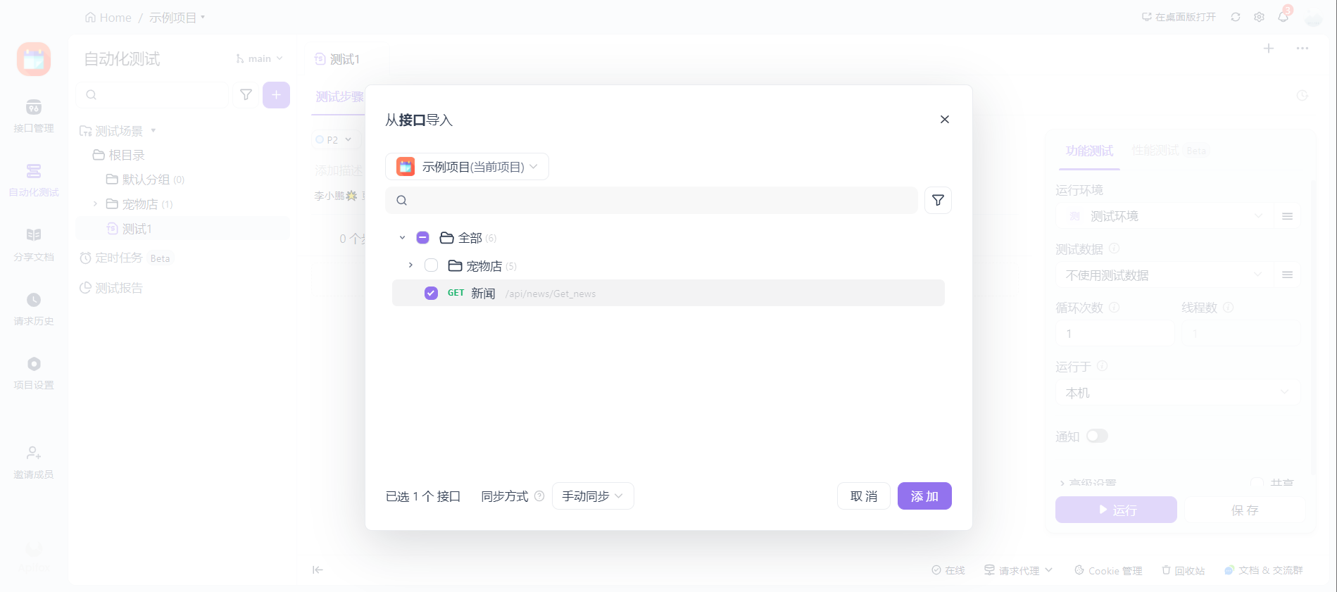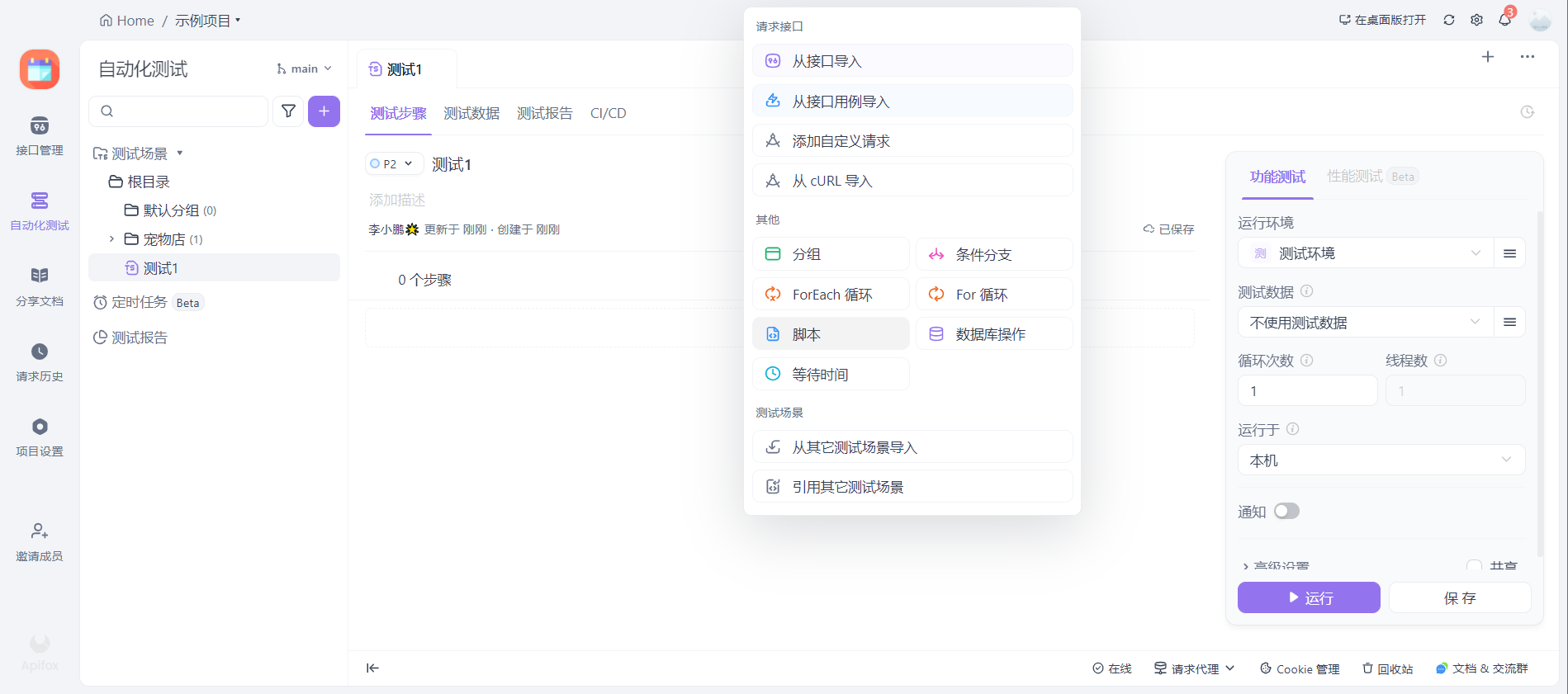 在测试场景中,我们需要增加测试步骤,这里可以增加多个步骤,也可以只增加一个。增加的方式有多种,从接口导入,添加自定义,从curl导入等,一般情况下,我们肯定是在接口中增加过并常规测试过了的。所以正常都可以从接口中导入。