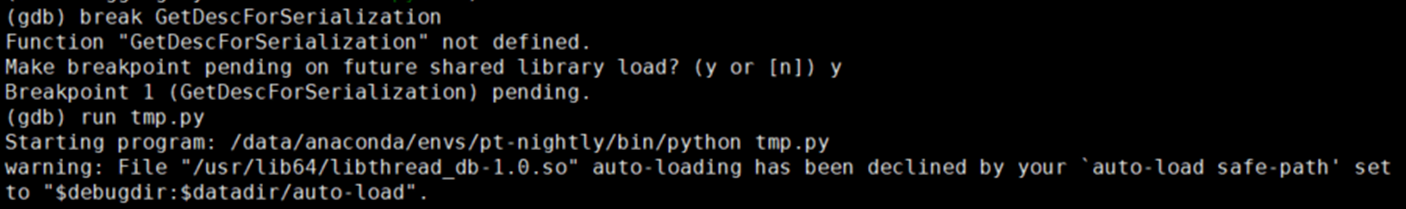 第二步:执行 gdb python,进入gdb,设置break,比如我们要debug GetDescForSerialization函数,就输入break GetDescForSerialization,选y,也可以直接break {文件}:{行数}。然后run脚本,例如此处我们的python脚本为tmp.py,就输入run tmp.py