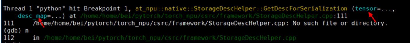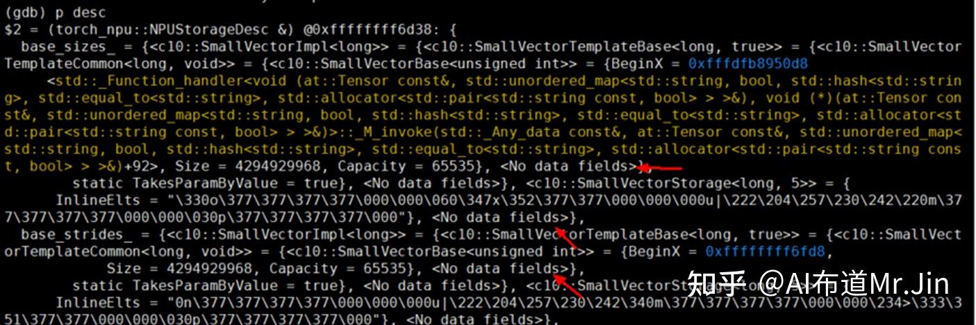 相较于release模式,debug模式下函数入参会显示为入参名字,可以直接print 出来。我们打印下要debug的对象,如 p desc,可以看到 desc.base_sizes_的内部成员的变量没有初始化赋值,主要是由于fake tensor没有storage但走到了这个流程导致的,我们直接添加storage是否为空的判断即可通过用例。