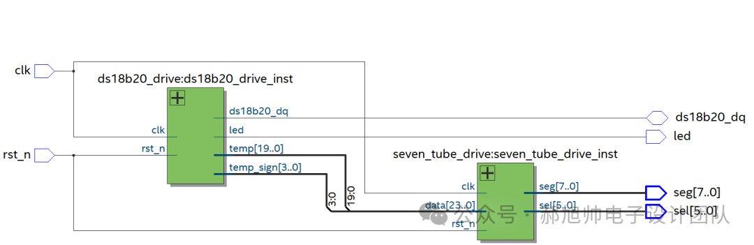 ds18b20_drive模块的功能为驱动ds18b20,获取温度,并且输出符号和温度的BCD码;seven_tube_drive模块的功能将符号和温度的BCD码输出,并且在右侧第三个数码管点亮小数点用以区分整数和小数。