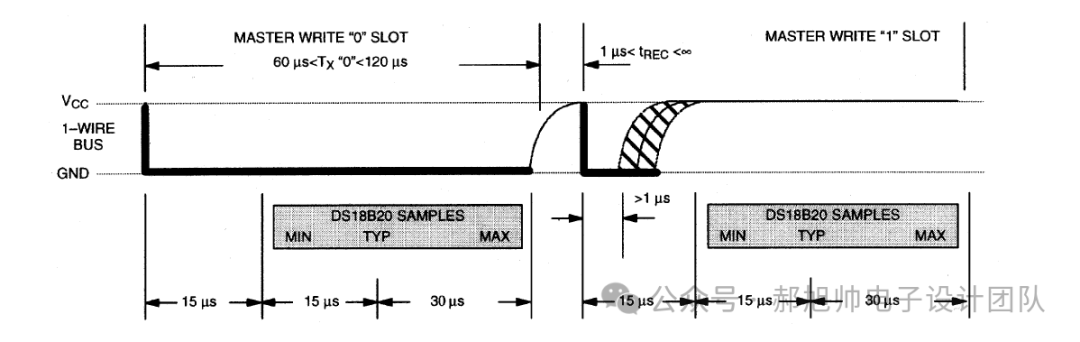 如果控制器想要发送1bit0,那么直接拉低DQ100us即可,然后释放总线;如果控制器想要发送1bit1,那么拉低DQ5us,然后释放总线即可。无论是写0,还是写1,建议每一bit的时长110us。