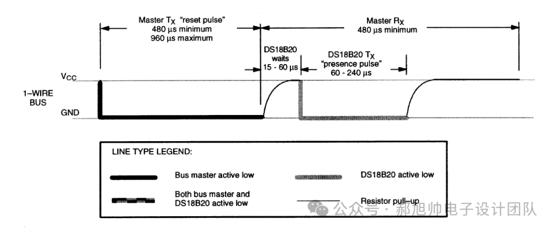 控制器需要拉低DQ,至少保持480us(最大不超过960us,建议:600us),然后释放总线控制(由于DQ被上拉,所以会被拉成高电平)。如果器件存在并且可以正常工作,器件会拉低DQ一段时间60-240us。