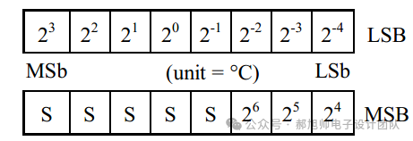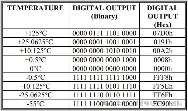 上图为默认精度(12bit、0.0625度),如果第12位为0,表示为正温度,测量出来的数据乘以0.0625就可以了。如果第12为1,表示为负温度,则需要将测量出来的数据减去1,然后所有位取反,得到的结果再乘以0.0625度。上述的表示方式就是有符号数在数字电路中的表示形式。