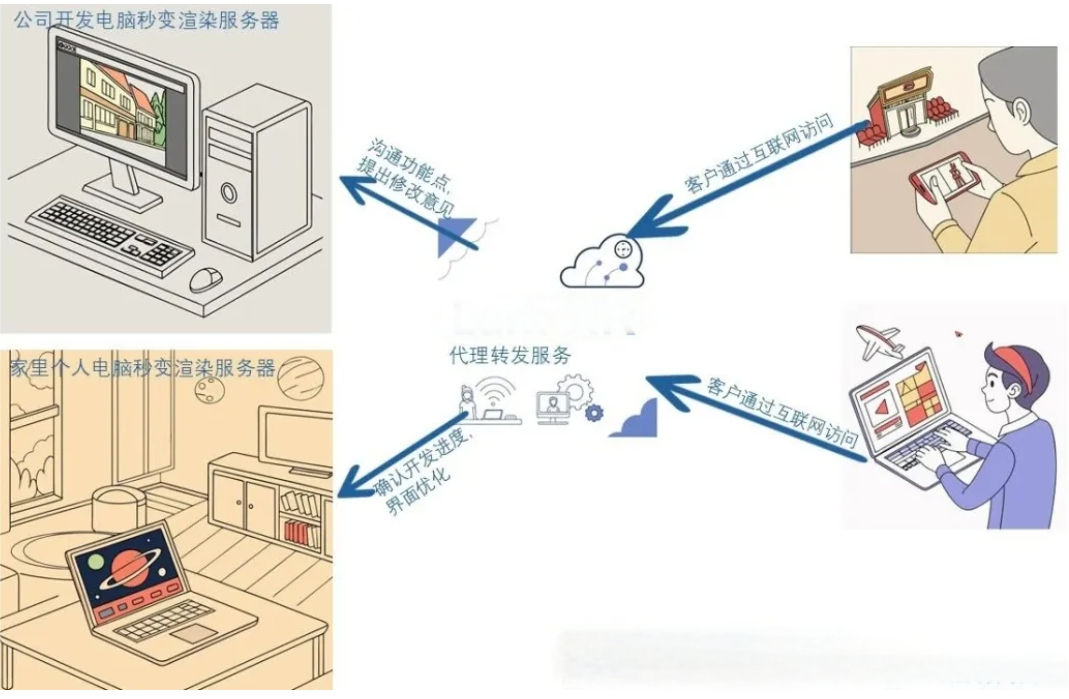 另外还有一些个人开发者,受限于成本、项目初期等诸多条件限制,使用本地服务器作为渲染节点,对外提供单台或者少并发的云渲染演示服务,这种情况下若要让互联网用户访问,需解决固定IP问题,国内家庭网络多为动态IP 。LarkXR提供的NAT代理转发服务,采用面向实时云渲染的转发服务,能快速解决无固定IP难题,把个人电脑变为实时云渲染服务器。该服务按客户端实际使用分钟数计费,无用户访问不收费。