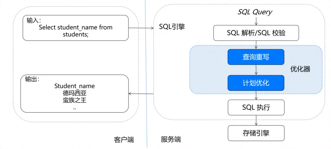 进入优化器之前,我们先来看一下数据库是如何处理一条用户输入SQL语句的。如下图所示,从接收到客户端发送的SQL语句,一般需要经历SQL解析、SQL校验、查询重写、计划优化、SQL执行等过程,最终服务端将SQL的计算结果返回给客户端。其中查询重写与计划优化的步骤,便是优化器所承担的关键职责。