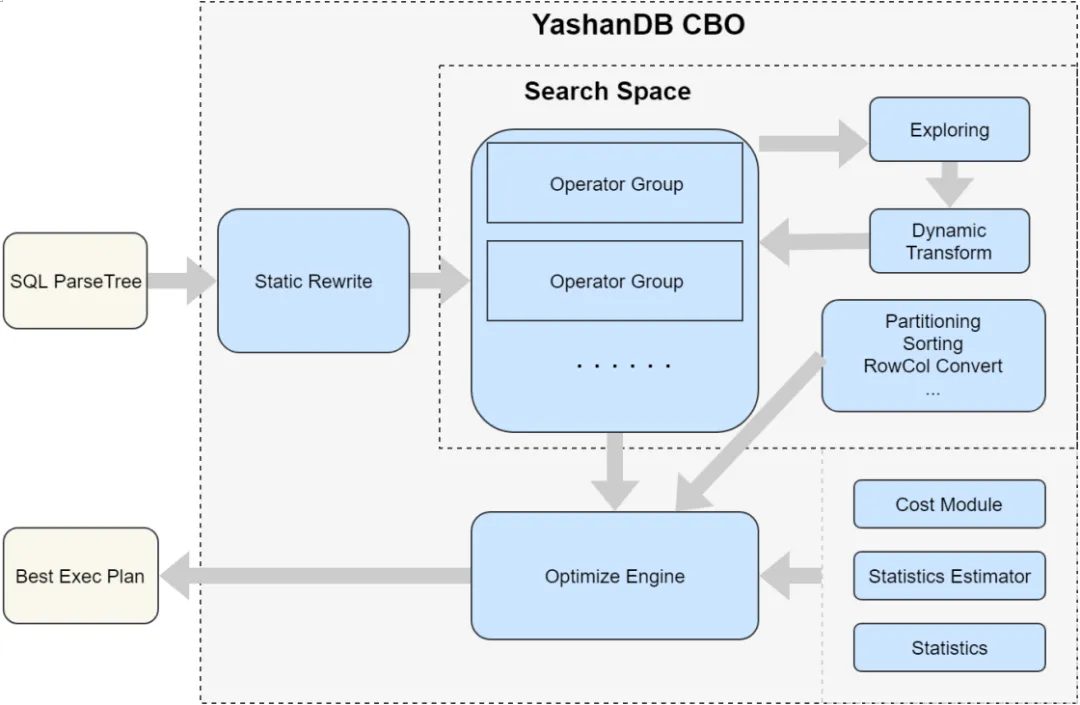 YashanDB动态优化部分基于Cascades框架设计构建,该框架可以较好的实现器各模块解耦,例如路径搜索与统计信息和Cost模型的解耦、查询重写规则与逻辑算子和物理算子的解耦等,路径扩展与最佳路径搜索的解耦等,通过各个模块的解耦,实现在任何模块都可以快速的增加开发一些新的功能的能力,比如可以快速增加一个物理算子,可以快速的增加一个查询重写的规则。