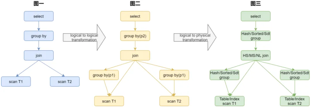 3. 逻辑转换阶段结束后,进入物理转化阶段,根据逻辑算子,产生相关的物理执行算子。在YashanDB数据库中,Group By的物理算子实现了Hash Group,Sorted Group和Sdt group,这样在每个阶段的Group操作,都会产生3个物理Group的路径,表示如图三。Scan会根据表和表上的索引,产生相关的Table Scan,Index Scan等物理执行计划。