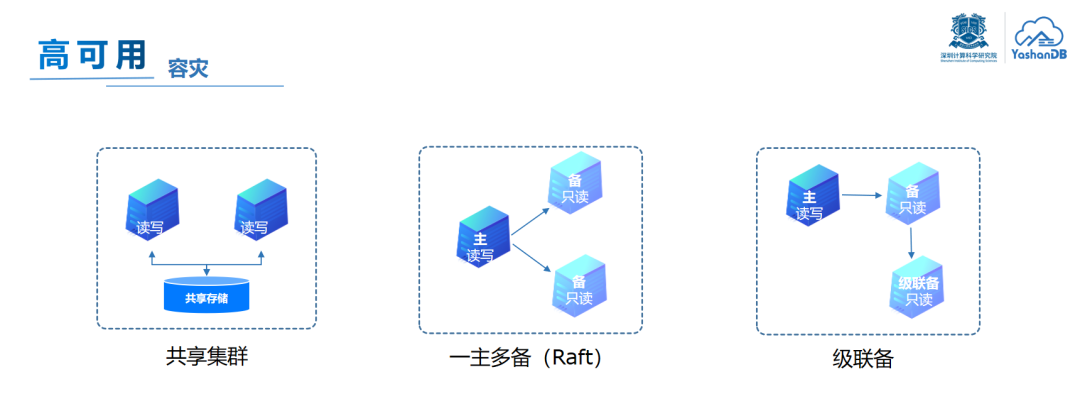 YashanDB支持主备复制、共享集群、分布式等多种高可用手段。其中主备模式采用物理日志复制模式,备库通过复制和回放主库日志,生成主库的数据副本,从而保证数据库系统的可用性,同时在一主多备情况下引入第三方仲裁者角色,基于Raft协议实现自动选举。