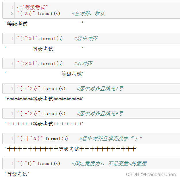 (2)<填充>、<对齐>和<宽度>主要用于对显示格式的规范。 宽度指当前槽的设定输出字符宽度,如果该槽参数实际值比宽度设定值大,则使用参数实际长度。如果该值的实际位数小于指定宽度,则按照对齐指定方式在宽度内对齐,默认以空格字符补充。 对齐字段分别使用<、>和^三个符号表示左对齐、右对齐和居中对齐。 填充字段可以修改默认填充字符,填充字符只能有一个。