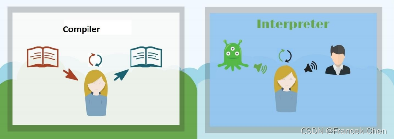 2、解释执行: 属于边 (单独) 翻译边(单独) 执行,类似于同声传译 Python、VB、JavaScript等 存在交互式和脚本式两种编程模式
