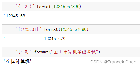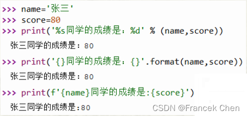 作为print函数的参数,用于控制输出的格式,有三种方法: (1)%操作符:类似于C中printf() (2)str.format方法:重点介绍这种方式 (3)f-string方法:Python 3.6版引入,相对更简洁