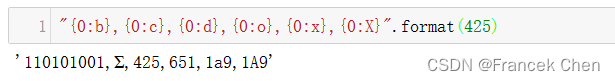 "{0:b},{0:c},{0:d},{0:o},{0:x},{0:X}".format(425)