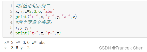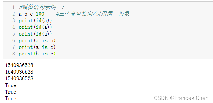 (1)赋值语句作用:将变量与特定的对象相关联 (2)几种常见的赋值形式: 允许一条语句同时为多个变量赋值相同的对象 允许一条语句为多个变量分别关联不同的对象 交换两个变量的值:x,y=y,x (3)还可以使用+=、-=、*=等复合赋值运算符进行赋值操作,但注意: 对于像数字、字符串这样的不可变对象:a+=b与a=a+b是等价的 而对于像列表一类的可变对象:a+=b与a=a+b并不等价!