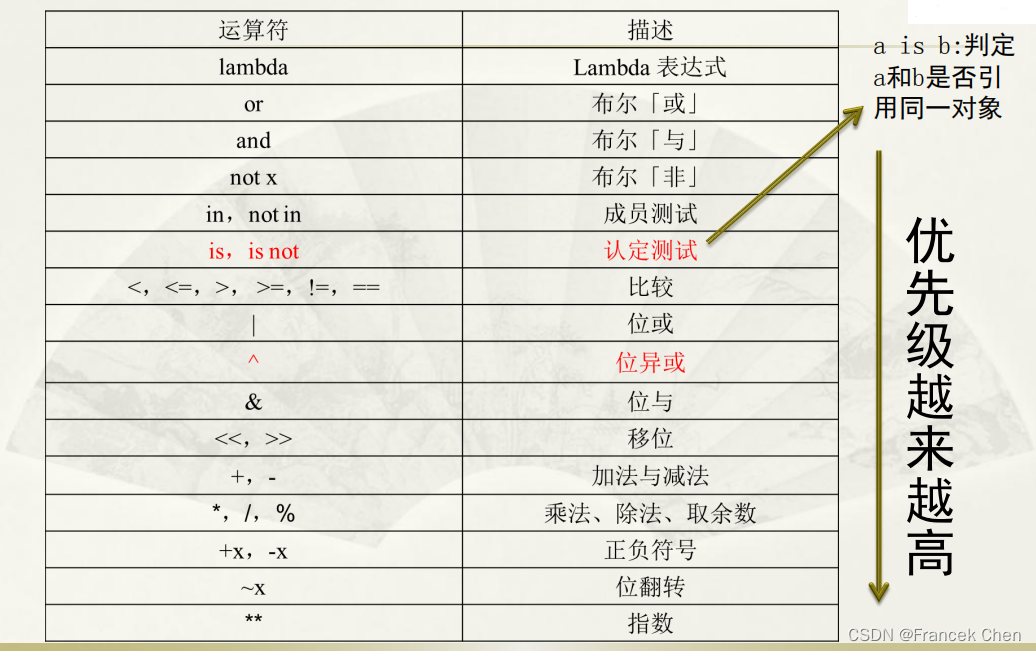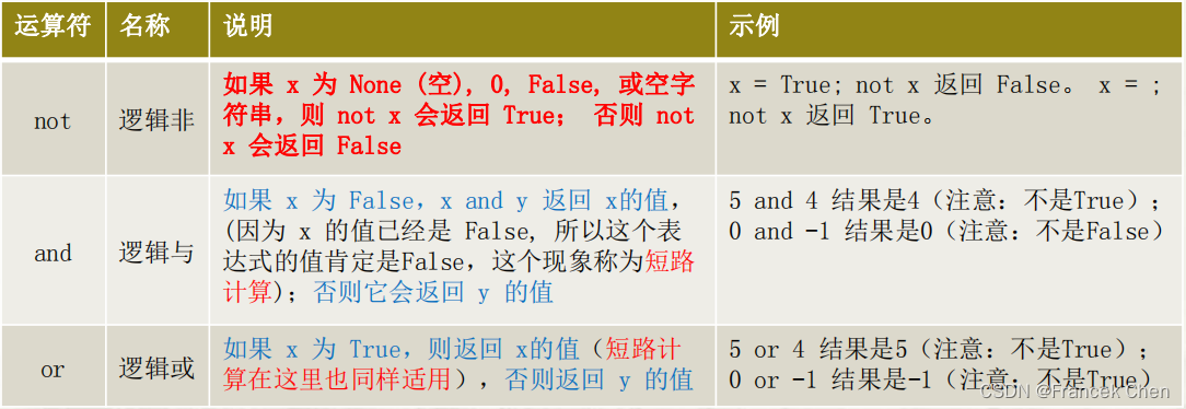 逻辑运算and和or的计算关键:(1)and优先级高于or; (2)最后结果由按照计算顺序能最快判断出结果的那个表达式来决定。