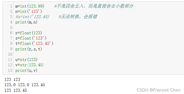 (1)显式转换:转换函数主要包括:int()、float()、str() 转换原则:能转则转 示例:num=int (input("请输入一个整数:")) real=float (input("请输入一个小数:"))