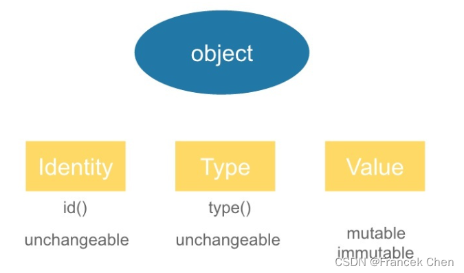 Python变量没有数据类型,有类型之分的是Python对象。 对象的三要素:标识(identity)、类型(type)、值(value)