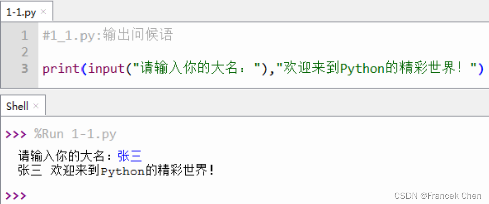 它是Python标准库的内建函数(build-in,即安装后自带的函数),可以直接用,不需要任何声明。 input()函数两种最常见形式: (1)运行时屏幕没有输入提示信息:input(); (2)运行时屏幕有输入提示信息:input(提示字符串)。 (3)返回值:用户输入的字符串。 (4)一定注意:返回值是字符串类型,如果需要其他类型的数据,要进行类型转换。