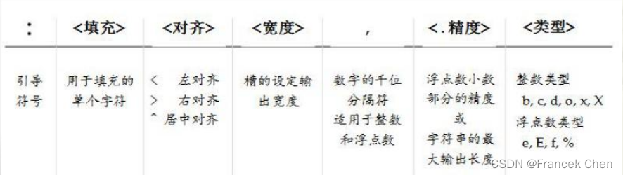 (1)format()方法中模板字符串的槽除了包括参数序号,还可以包括格式控制信息。 {<参数序号>:<格式控制标记>} 其中,格式控制标记用来控制参数显示时的格式。格式控制标记包括:<填充><对齐><宽度>,<.精度><类型>6个字段,这些字段都是可选的,可以组合使用。