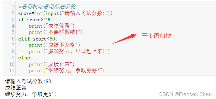 缩进表示的重要性: (1)反映语句间的层次隶属关系,缩进位置相同的语句构成一个语句块; (2)缩进尺寸默认是四个空格,也可以不是四个空格,但一个程序文件中必须要统一。