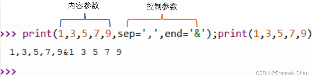 (3)内容参数必须在控制参数之前 (4)两个常见控制参数:sep和end sep:指定输出内容之间的分隔符,默认是空格 end:指定全部内容输出后的字符,默认是换行符(“\n”) (5)查看print函数的帮助信息:help(print)