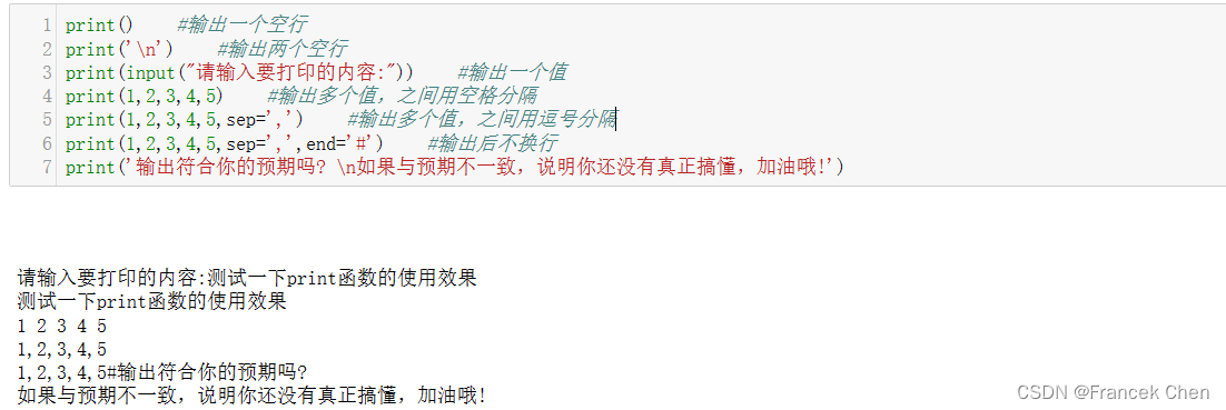 print('输出符合你的预期吗? \n如果与预期不一致,说明你还没有真正搞懂,加油哦!')