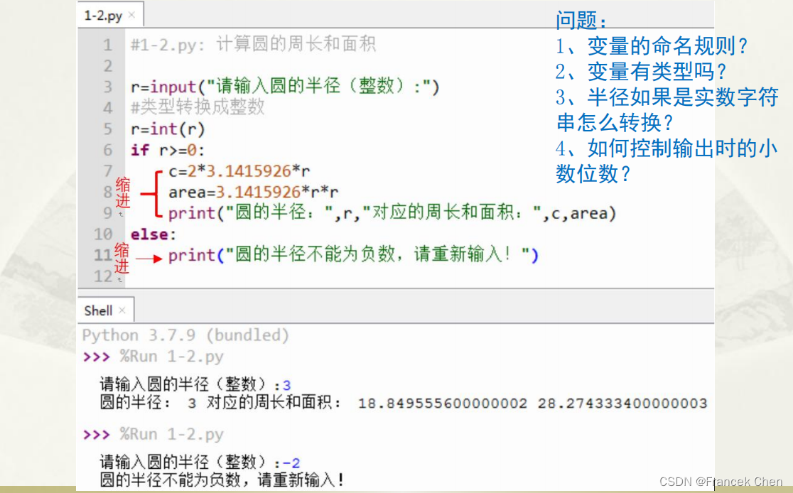 为了程序通用性,应允许计算不同半径下的周长和面积,为此考虑引入变量,分别表示半径、周长、面积。