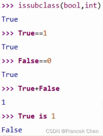 bool型是int的子类,只有True和False两个值(注意:只有首字母大写) True和False属于特殊的整数,可做整数相关运算:True(值等于1),False(值等于0)。