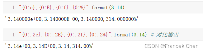 "{0:.2e},{0:.2E},{0:.2f},{0:.2%}".format(3.14) # 对比输出